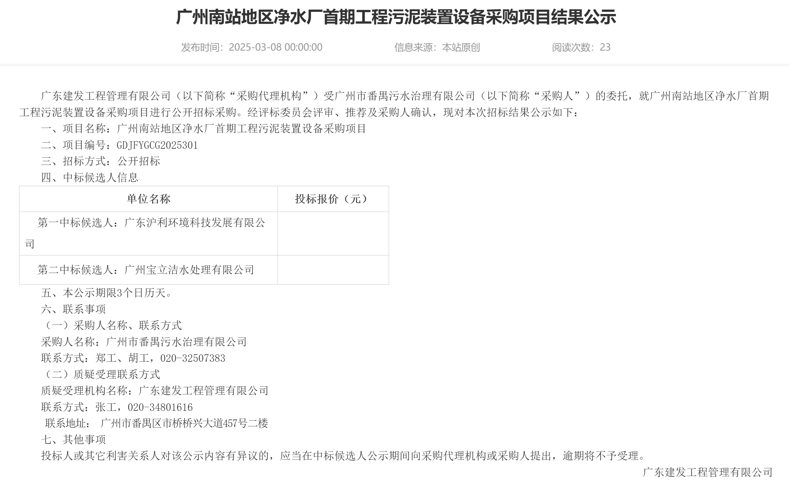 【项目动态】喜报! 我司成功中标广州南站地区净水厂首期工程污泥装置设备采购项目!